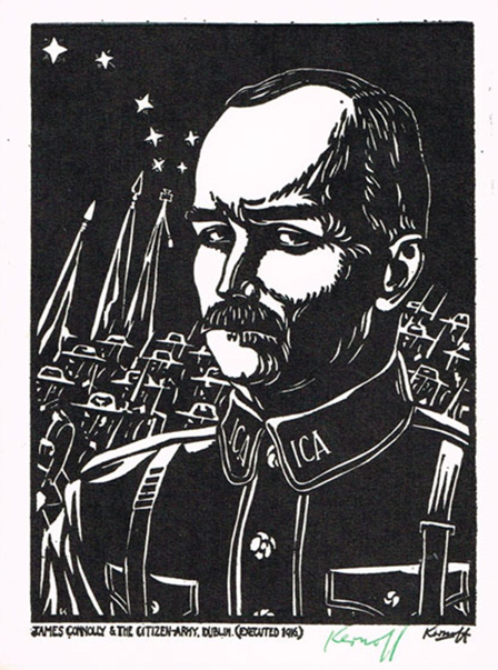 Harry Kernoff, born in London in 1900, moved to Dublin at the age of 14. After winning the Taylor scholarship in 1923 he became a full-time day student, encouraged by established painters such as Seán Keating and Patrick Tuohy . He showed a particular interest in drawing Dublin, and was one of the few artists at work in the city whose work demonstrated a social conscience and awareness of the plight of the unemployed, as revealed in such paintings as ‘Dublin kitchen’ (1923). Strongly left-wing, he was a member of the Friends of Soviet Russia and his woodcuts were often used in republican and labour newspapers in the 1930s and 1940s. He designed the masthead of the communist weekly the Irish Workers’ Voice, was part of a delegation to visit Leningrad and Moscow (1930) and was involved in anti-fascist campaigns in Dublin. One of his most famous woodcuts is the (below) 1936 one of James Connolly. Thirty-four years previously Connolly had issued an election leaflet written in the Yiddish language to the Jewish voters of Dublin’s ‘Little Jerusalem’. Kernoff lived at 1 Stamer Street, Portobello, in the heart of this area, for the last 40 years of his life. He passed away in 1974.