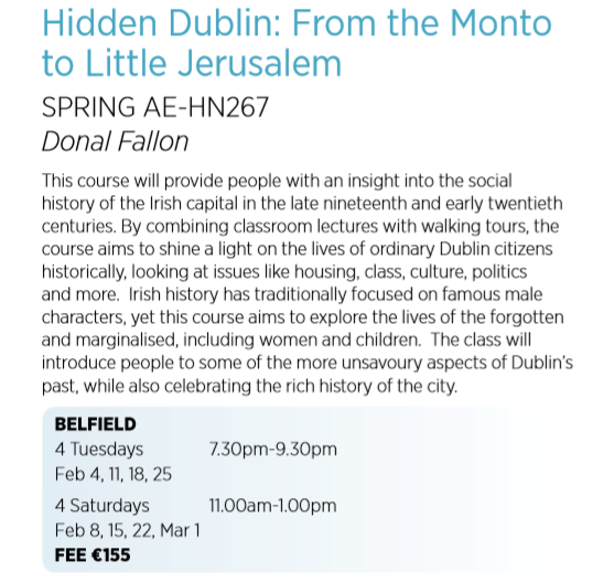 Last year, myself and Dr. Irial Glynn put together a course with the Adult Education Department of U.C.D, looking at the hidden history of Dublin, and focused on social history and forgotten people from the late nineteenth and early twentieth centuries. It looked at issues like working class childhood in the city, Dublin’s history of prostitution, labour agitation in the capital and the tenement city.