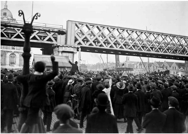 A photograph of the protest meeting at Beresford Place, and the arrest of Count Plunkett. Credit – Keogh Photographic Collection, NLI.