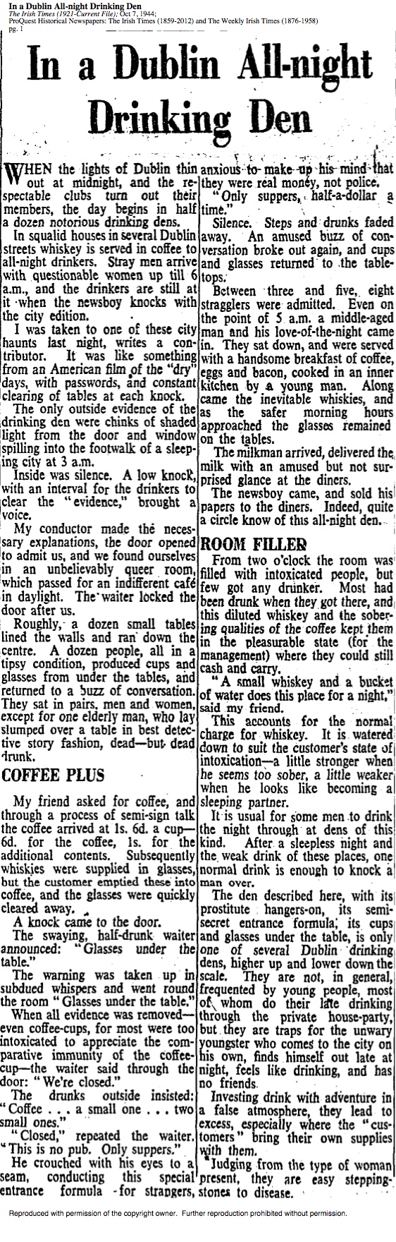 The Irish Times (7 Oct 1944) ran a front page piece about a journalist’s visit to an “all-night drinking den”. My bet would be that it was Dolly Fawcett’s.