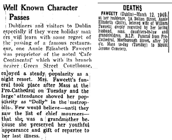 One of the City’s most famous ‘kips’ was the Cafe Continental at 1a Bolton Street near the corner of Capel Street which was in operation from the 1930s (?) to the mid 1960s. It was run by the legendary madam ‘Dolly’ Fawcett (often misspelled as ‘Fossett’ or ‘Fosset’). Annie Elizabeth, originally from Wicklow, married William Fawcett who was rumoured to have been a former Dublin Metropolitan Police (DMP) officer from the North who was discharged because of his relationship with her.