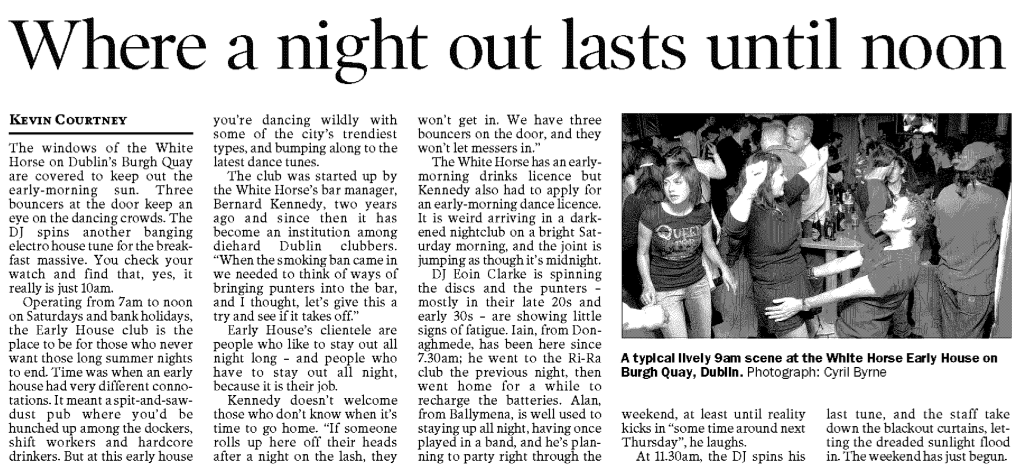 Piece on the early-house DJ nights at the White Horse (now Dark Horse). The Irish Times, 17 August 2006.