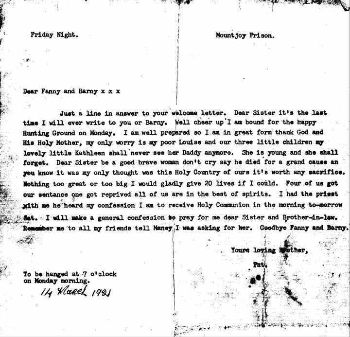 As he lay on his deathbed (the nuns) said his one worry was, “Are the boys beaten?”, and that night as the sound of nearby explosions shook the air, Sean’s face, wreathed in smiles, turned to the Nun who was attending him, and he feeble whispered, “Thank God, Sister, the fight goes on”.
