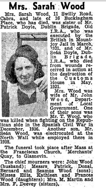 The Irish Press (29 Oct 1941) reported on the death of Sarah Woods (nee Doyle):