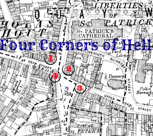 The Four Corners of Hell was the colloquial name given to the junction where New Street, Patrick’s Street, Kevin’s Street and Dean Street met in The Liberties, Dublin 8.
