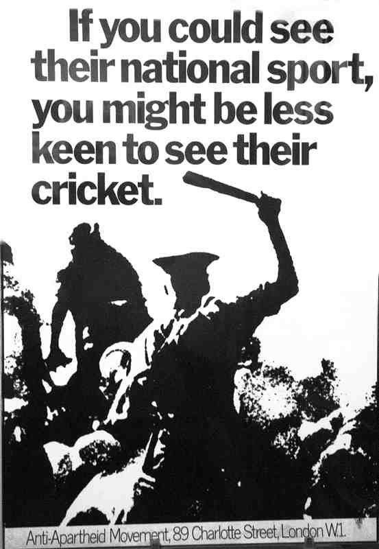 A poster from the British movement against Apartheid produced at the time of the cricket controversy. Via: http://africainwords.com/2014/04/28/forward-to-freedom-anti-apartheid-movement-1959-1994/)