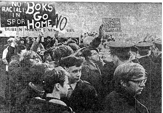 The world of politics and the world of sport have been known to collide from time to time in Ireland. In 1952 for example, Archbishop John Charles MacQuaid urged the football loving people of the capital not to attend an international friendly in Dalymount Park which saw Ireland take on communist Yugoslavia. Sporting stadiums have been used as venues in which to stage political protests too, with political banners appearing on the terraces of Croke Park during the Troubles. One particularly interesting moment in the history of controversial sporting clashes in Dublin concerns the sport of rugby, and the visit of the Springbok team to Dublin in 1970. All all-white team from South Africa, the team were seen by some to be the embodiment of Apartheid South Africa, and their tour of Britain and Ireland in 1969/1970 attracted huge protest. While the Springbok team did play in Lansdowne Road in January 1970, the game occurred behind barbed wire fencing and in front of a small attendance.