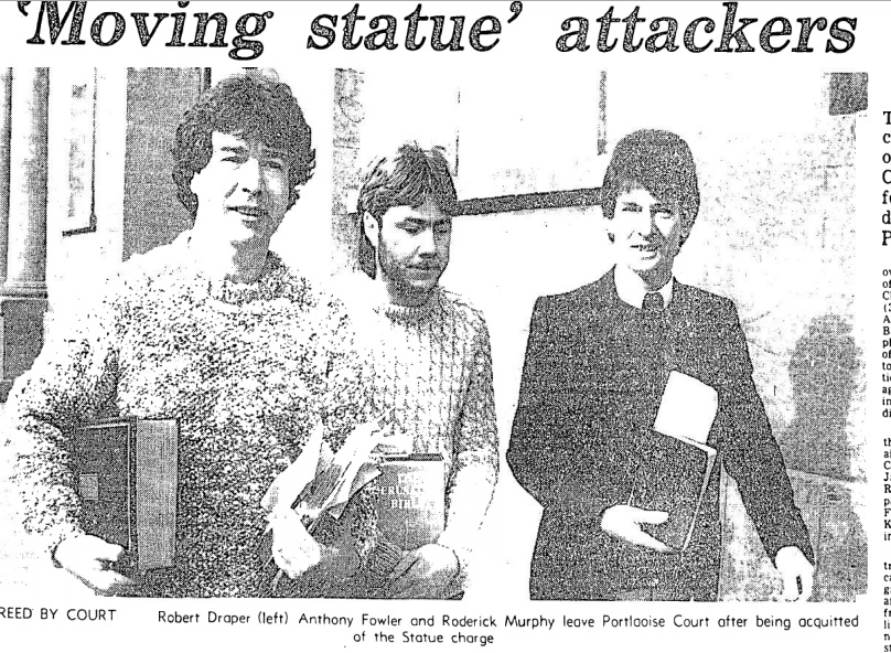 In court, it became clear that the leader of the men was Robert Draper. He described himself as a preacher of the Christian Faith Centre of Ireland, and a follower of Dr. Gene Scott, an American pastor and religious broadcaster. Draper was living in Clondalkin at the time, as was one of the other men, while the third was a CIE worker from Ballymun. Draper used the platform provided to put forward his own religious beliefs, telling those gathered that “all false idols must go”, and newspaper reports noted that he boasted that since attacking the monument he had “slashed the face of the statue of the Blessed Virgin outside the Catholic Church in Ballyfermot. As a Christian, Mr. Draper says his convictions force him to act against these images, which offend God.” The Irish Times noted that: