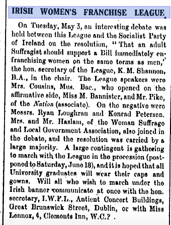 His english much have improved greatly as on 3rd May 1910, he is listed as taking part in a debate between the Irish Women’s Franchise League and the Socialist Party of Ireland. The resolution was “That an adult Suffragist should support a Bill immediately enfranchising women on the same terms of men”. Speaking in favour were Mrs. Cousins, Mrs. Bac, Miss B. Bannister and Mr. Pike of The Nation newspaper. Speaking against were Mr. Ryan Loughran and ‘Konrad Petersen’. Presumably both were representing the Socialist Party of Ireland.