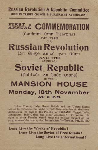 In February 1918, Peterson was present at large meeting that took place at the Mansion House to celebrate the Russian Revolution. The Irish Times (9th February 1918), reported that those present wished “to congratulate the Russian people on the triumph they have won for democratic principles“. During the proceedings, “The Red Flag” was sung and red and republican flags were waved.