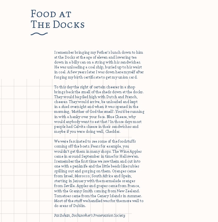 In the area I worked, Dublin Central, we focused on the history of food. From East Wall to the Markets area, Dublin Central is strongly bound to the story of food production in the city, and the story of foods arrival and departure. We interviewed dockers, chip shop workers, slaughterhouse staff, street traders, market workers and more besides for what became a beautiful oral history production.