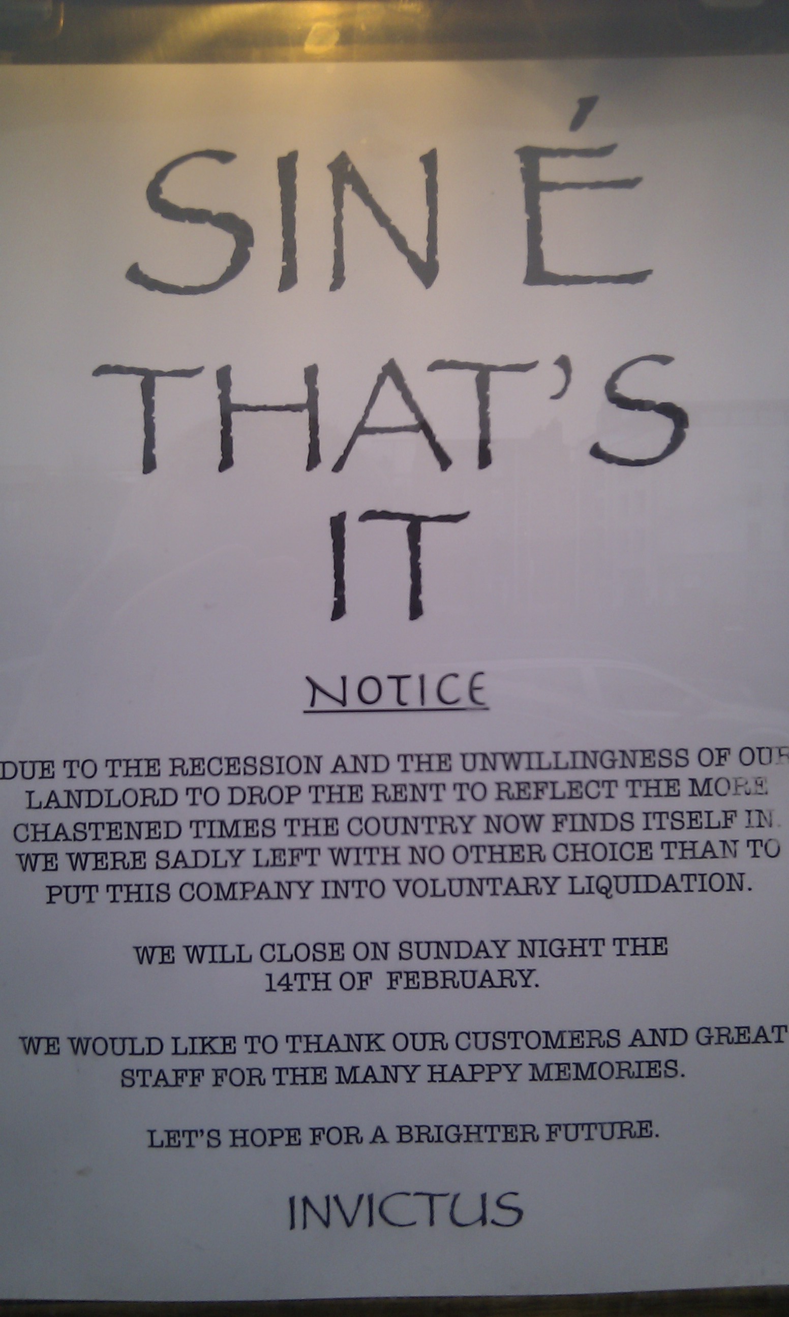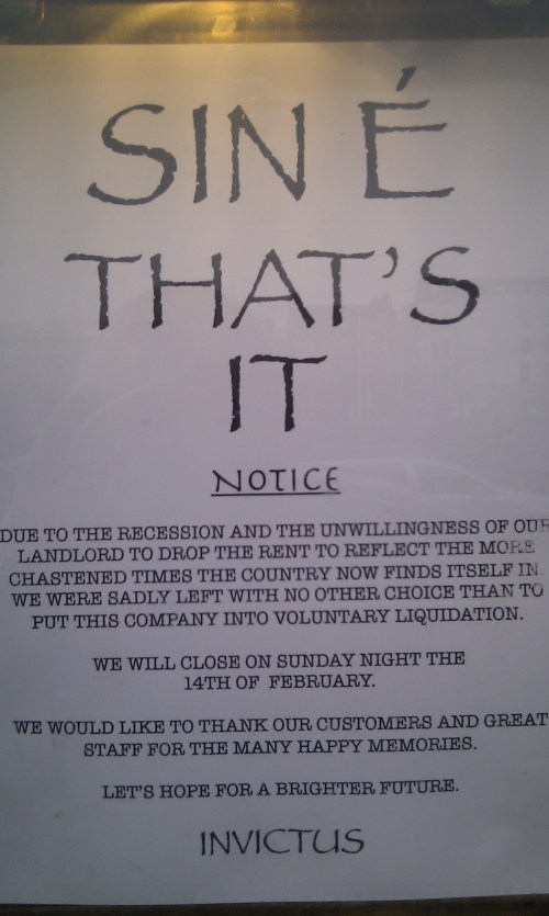 Well, the worst financial news since Brian Lenihan and Oli Rehn sat down together has reached us here at the blog. Half price Sunday in Pygmalion is no more. Now, it is 40% off.