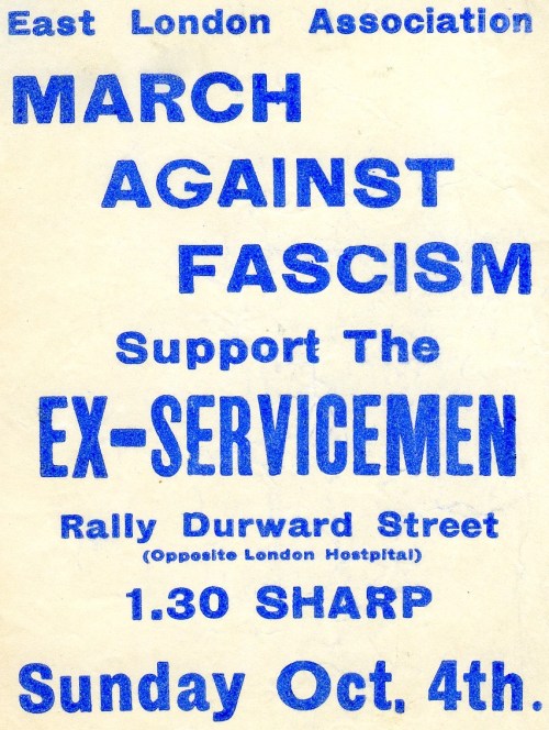 Here, for (the first time ever online?) are original leaflets printed in the run up of October 4 calling on people to join the anti-fascist march. (Note: I see the second one is online but I don’t think the other two are)