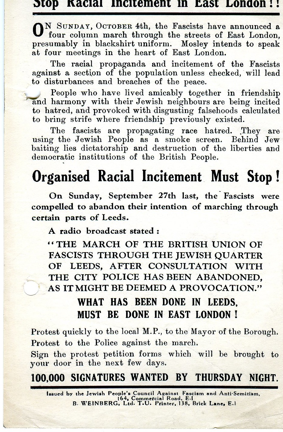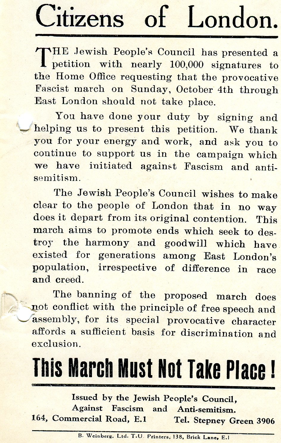 Leaflet from the 'Jewish People's Council Against Fascism and Anti-Semtism' calling on people sign a petition to ban the march, October 1936. Scanned in by Jay Carax.