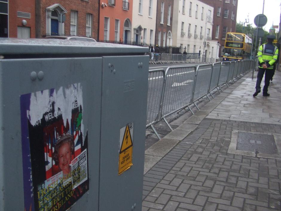 Late yesterday evening I found myself in the city centre and gave hxci of this very parish a buzz, knowing he’d be about. We went for a walk around ‘fortress Dublin’, on both sides of the Liffey. We took in Dame Street, Parnell Square and other sites which will be central to the royal visit. Here are a few snaps.