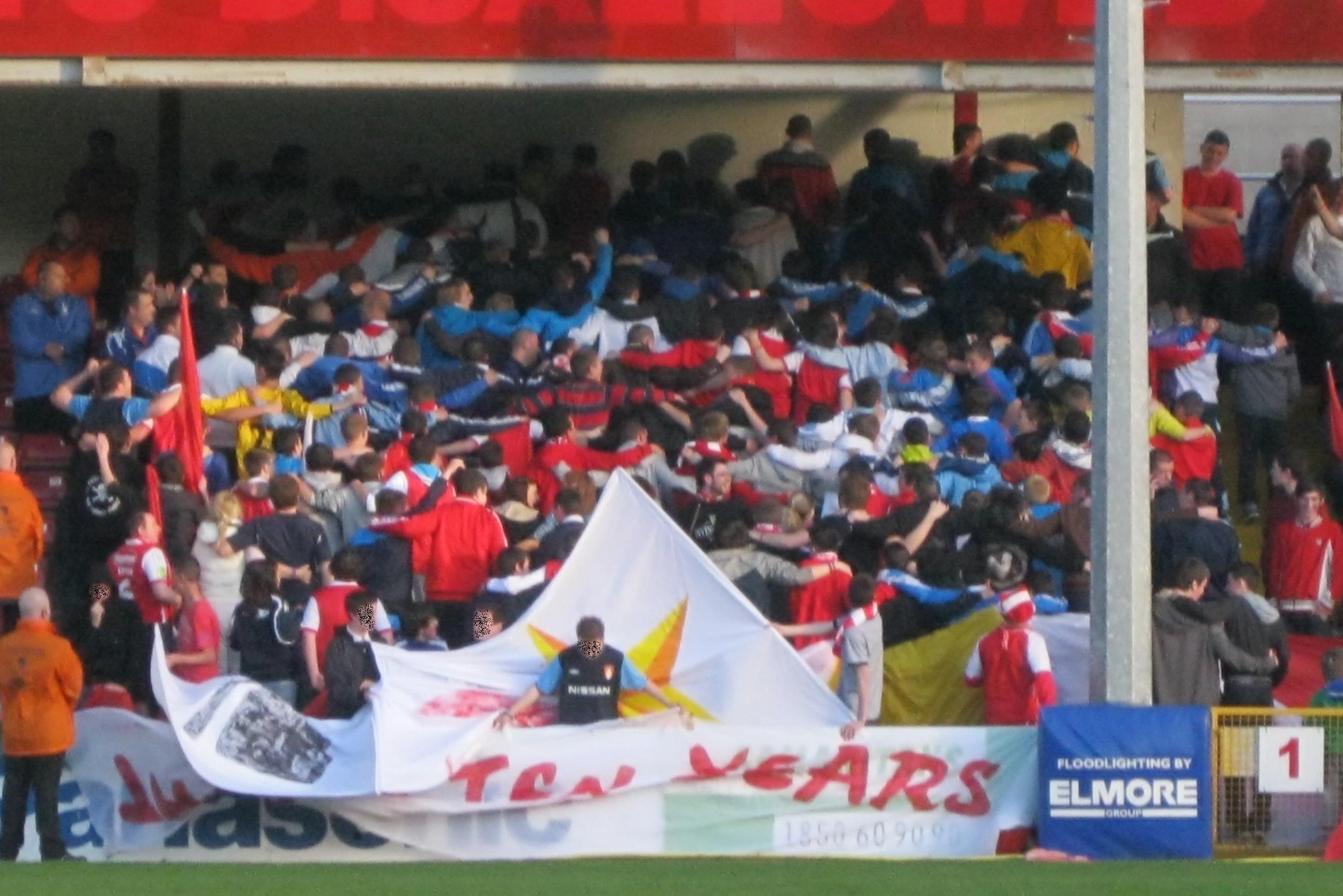 Unusually for us, we watched the game from the shed. We’ve been playing musical chairs around the stadium in recent years, but have made the mainstand home. It was nice to be down here. The shed is unusual in that now it houses the away fans on big nights. Taking up our place in the centre of it, a few dozen of us decided to make as much of a racket as possible.