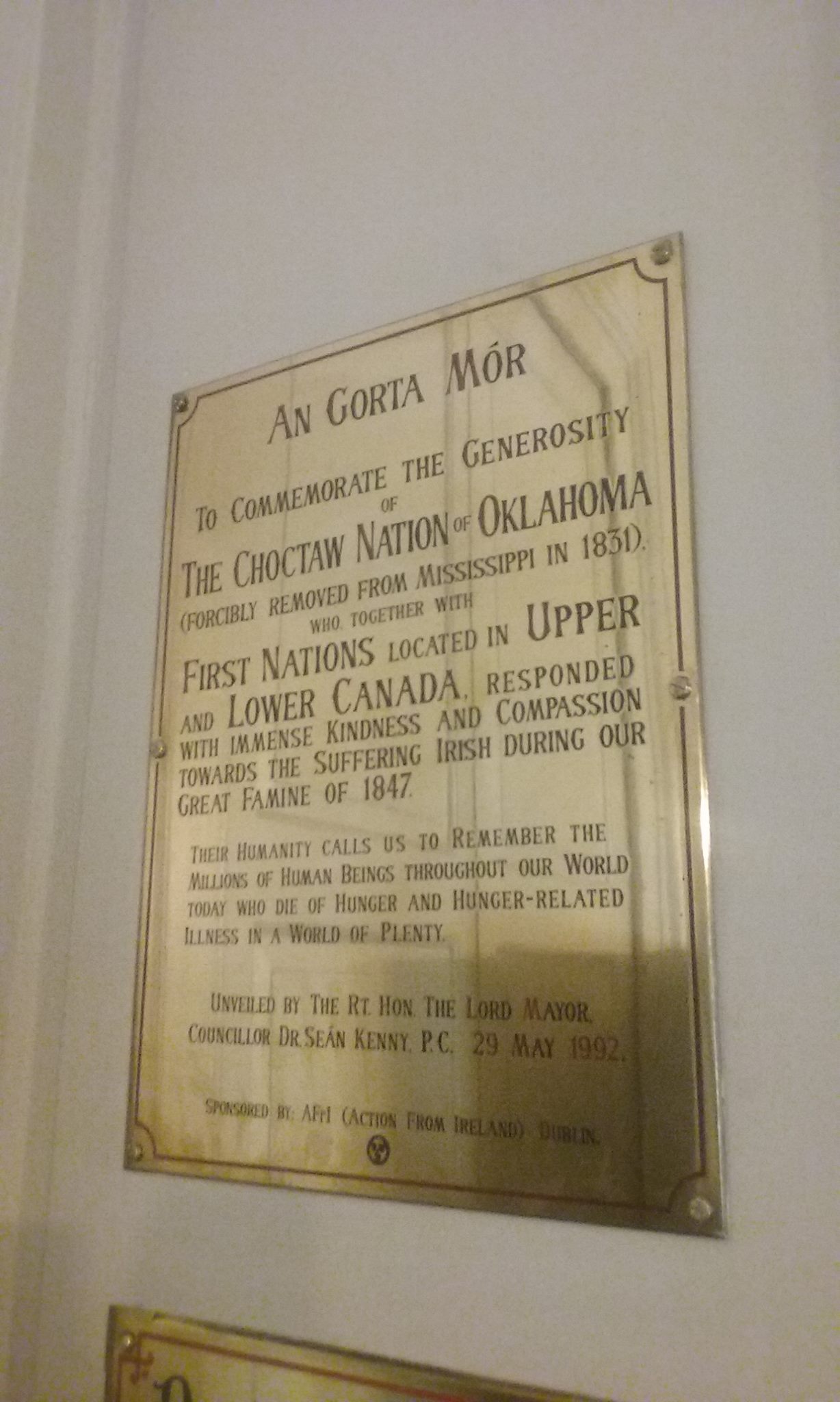 In the hallway of the Mansion House, a plaque commemorates the financial assistance given by the Choctaw Native American people to the Irish during the years of the Great Hunger. A people who had themselves been displaced and dispossessed, it was a remarkable and unlikely act of solidarity. Gary White Deer, a representative of the Choctaw Nation, has visited Ireland and described this moment in history as a “sacred memory.”