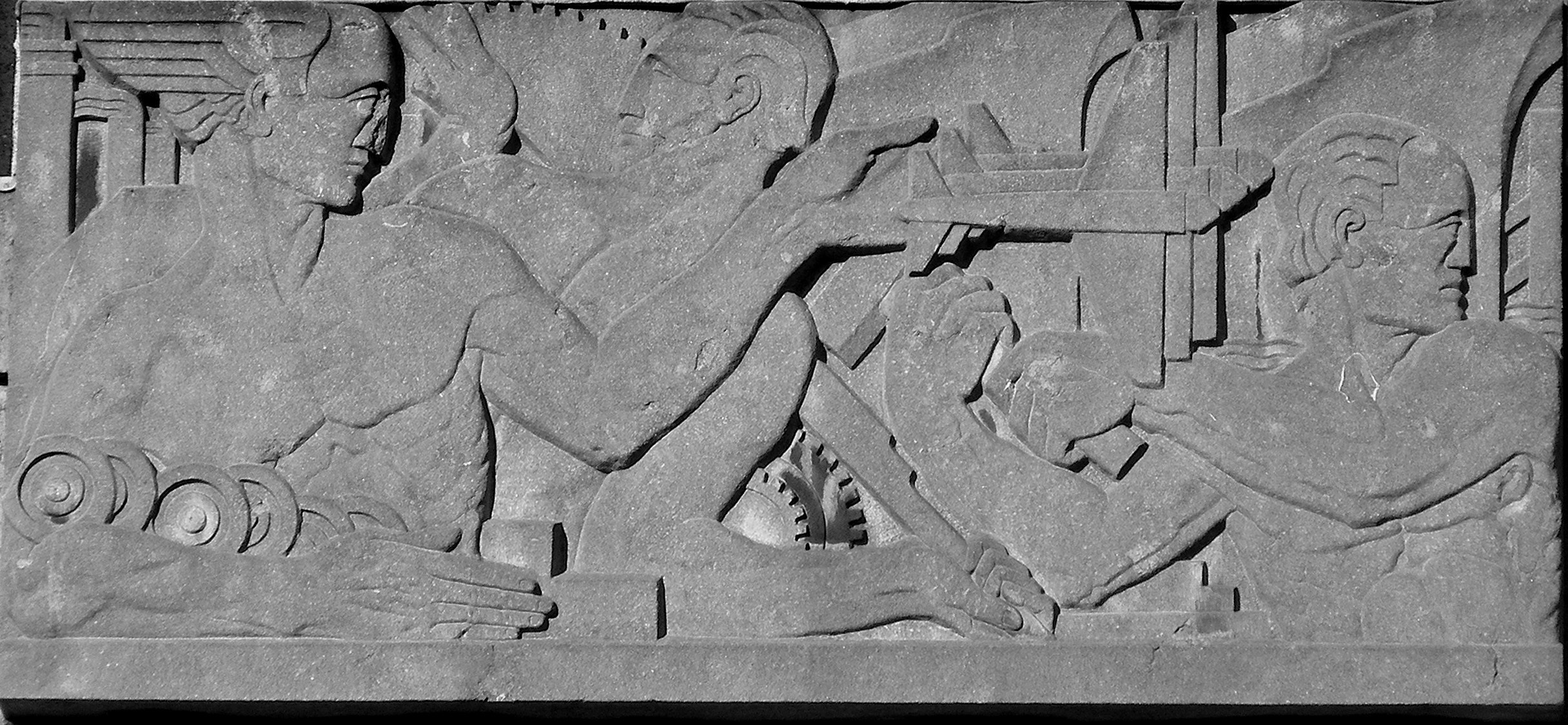 The Buildings of Ireland website describes the premises as “one of Dublin’s most interesting twentieth-century architectural gems.” What caused me to stop recently passing by it were the bas-reliefs by Gabriel Hayes, depicting Irish industry through the ages. Described by Paula Murphy as being “carved in a vigorous socialist-realist style”, they are a remarkable artistic achievement.
