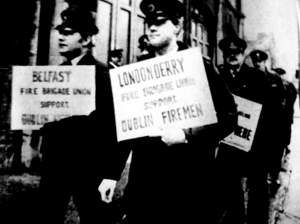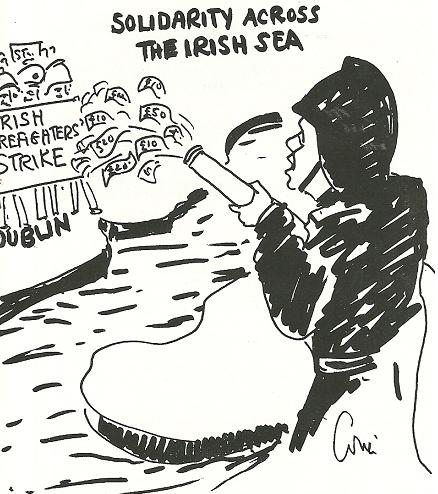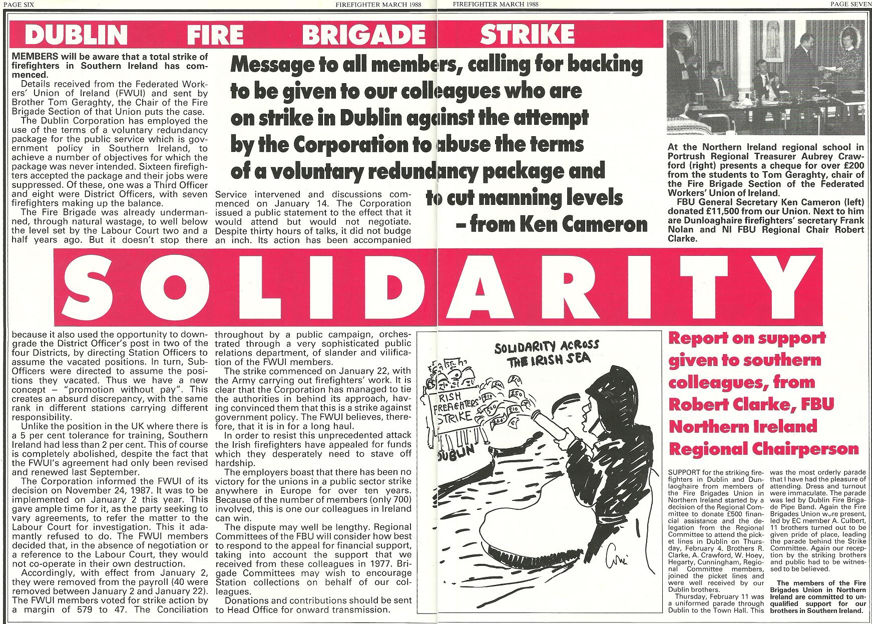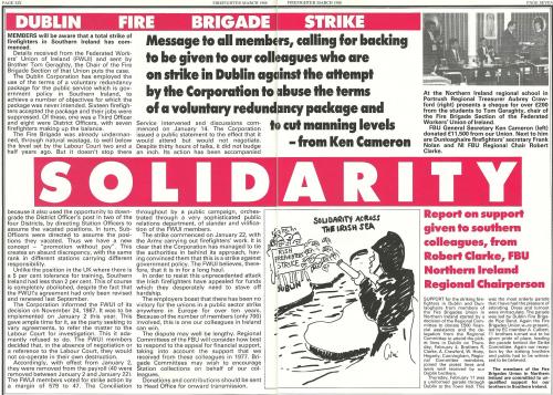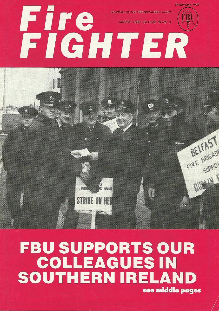 Firefighters in London have been in the news recently as a result of industrial action against savage attacks on their working conditions. These scans come from the magazine of the FBU,Firefighter, during the 1988 dispute in Dublin. It is a show of solidarity from the UK union to the Dublin firefighters. I have also scanned up an image from the strike, showing a ‘Londonderry FBU’ placard on the streets of Dublin. At a time of political tension in the six counties, firefighters there ignored sectarian divisions and supported their Dublin colleagues. With events in London, this is a timely reminder of what international support can mean to a strike. It has never been scanned online before.