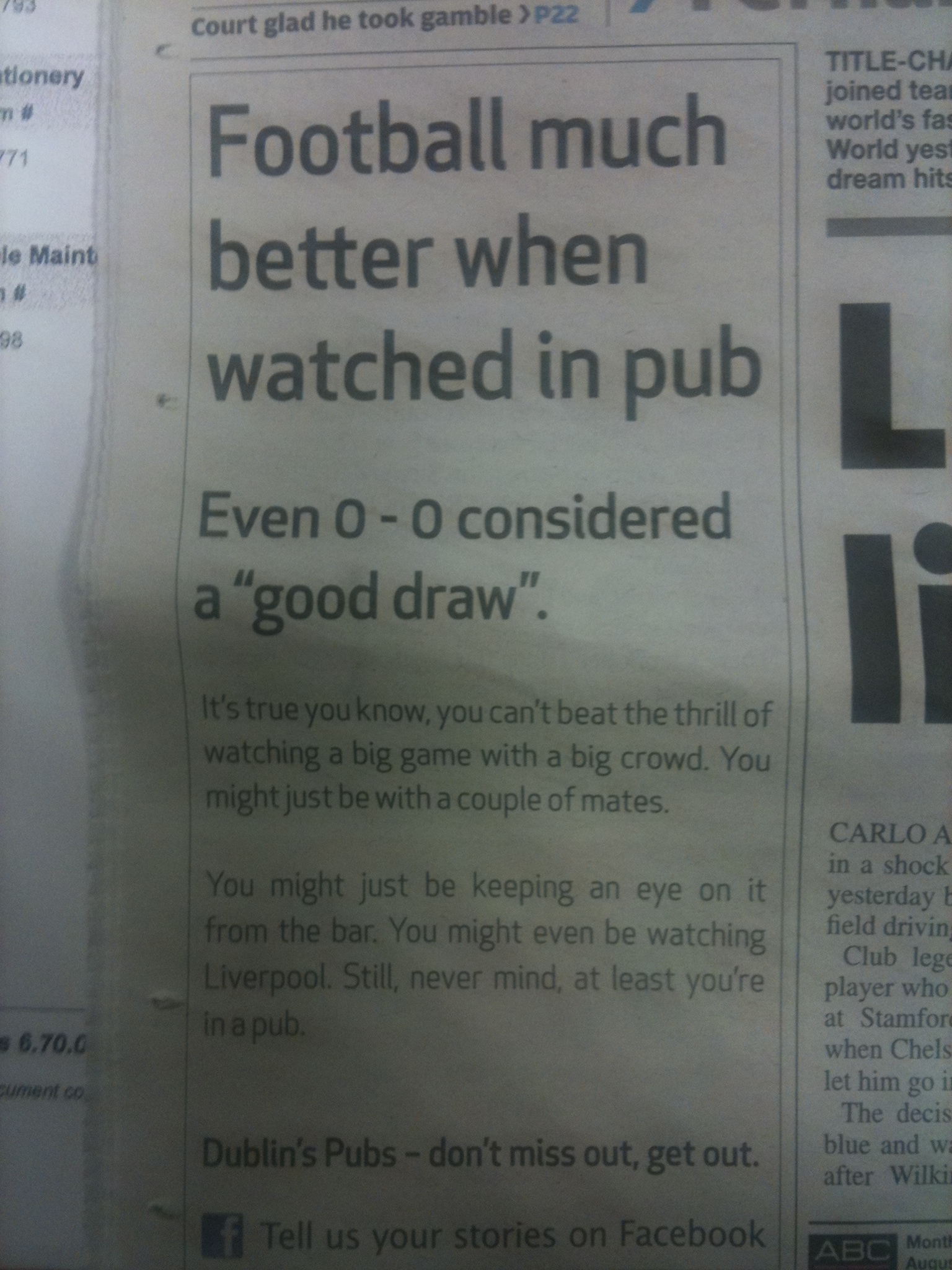 The gem of a picture that accompanies this piece was spotted in Friday’s Metro by a good mate of mine. Now, I know the domestic season is over, the cup final done and dusted (with a deserved victory for Sligo Rovers, and their ex- Bohs talisman Joe Ndo) but this takes the biscuit, really pushing us as a nation of barstoolers to the limit. We often wax lyrical on here about the League of Ireland, no it doesn’t draw the masses, and no, its not always sexy. But its ours, and thats what counts. So seeing ads like this is a real slap in the face for the League- Football is not much better when watched from a pub, its much better watched from the steps of the Jodi Stand in Dalymount Park, or the shed in Richmond Park, even the bloody lego stand in Tolka Park is better than a pub.