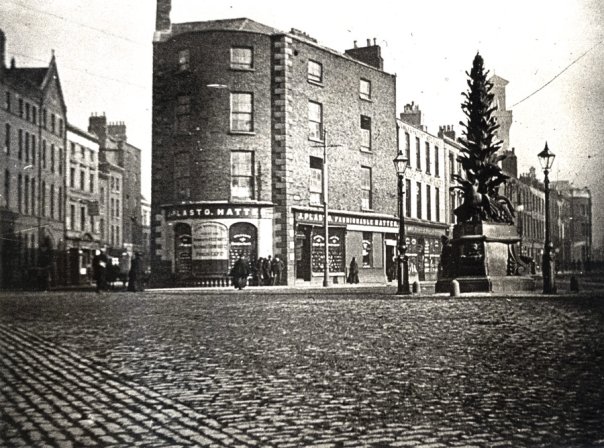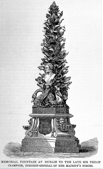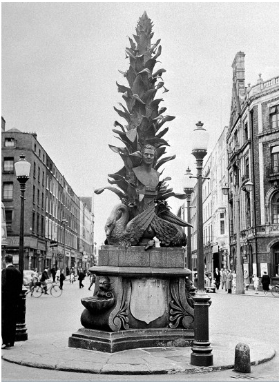 The Crampton Memorial, known colloquially as ‘The Water Baby’ and ‘The Cauliflower’, took its place and was situated at the junction of College St. with Pearse St. and D’Olier St. for nearly one hundred years. It was designed by John Kirk (son of Thomas Kirk (1781 – 1845)) and is named after Sir Philip Crampton (1777–1858), an eminent surgeon and anatomist. The memorial, which was made up of a stone base with three drinking fountains, slowly fell apart and was finally removed in 1959.