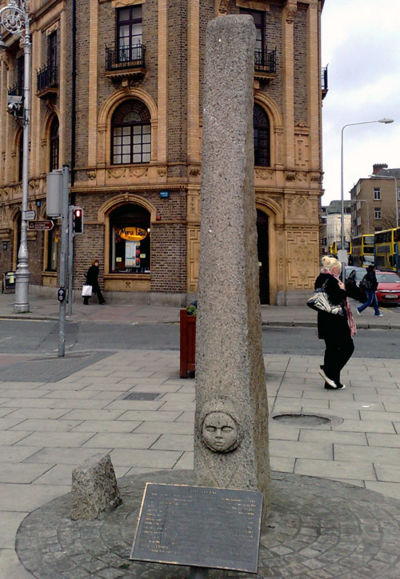 In 1986, a replica of the Long Stone (designed by Cliodhna Cussen, mother of Aengus Ó Snodaigh and Rossa, Rónán, and Colm of Kíla) was erected. The 11 foot granite sculpture has the head of Ivar, the first Norse king of Dublin and who is believed to have erected the original Stein, on the base of one side and a head of a nun, from All Hallows monastery, which is thought to have been situated on the site in the Middle Ages, on the other.