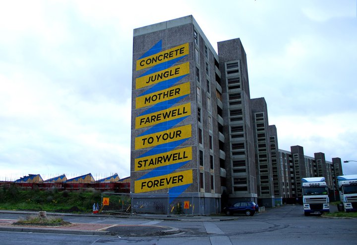 Any regular readers will know that we’ve been following the Maser/ Damien Dempsey project very closely; And on Sunday I came across my favourite piece from the project so far. Located between the Point and the Port Tunnel, and spanning close to fifty feet are the words “Greed is the knife and the scars run deep,” lyrics taken from one of my favourite Damo songs, Colony. Youtube it, the song sends shudders up my spine every time. The raw anger in his voice when he sings the line “But if you’ve any kind of mind, you’ll see that all of humankind are the children of this earth, and your hate for them will chew you up and spit you out” will forever be one of my favourite lyrics. Amazing. Just… Amazing.