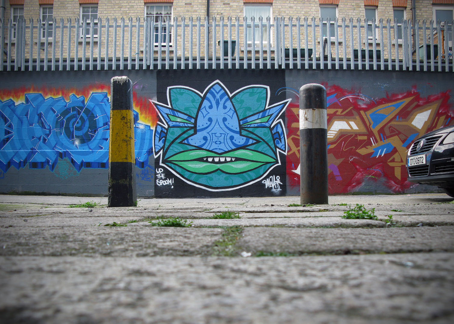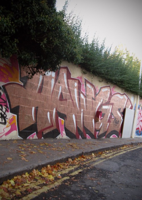 As small as Dublin is, and as much of it as I’ve covered traipsing around on my bike, the city never ceases to throw up surprises. Heading off on the bus to Dundalk from Dalymount on Friday evening (a beautiful evening on a hijacked double decker bus, ending in a rubbish defeat and getting home at silly o’clock on Saturday morning,) I spotted some graffiti at the entrance to the lane-way linking St. Peter’s Road with Cabra Park. Heading up for a look this evening, I wasn’t let down, with another trove of street art from some of Dublin’s finest. Sorry for the angles on some of the shots, the alley is so narrow as to make a head on shot impossible!