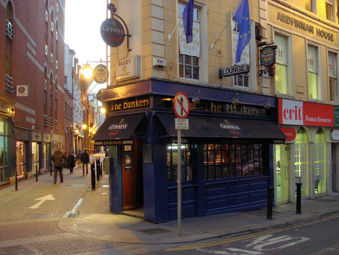 Four down, one of the five remaining. Its about this stage I begin to feel real pity for hxci, JayCarax, J. and H. We’re now 10 pubs in, the introduction pages of what will hopefully prove a War and Peace length book with a massive appendix to boot. Even considering that though, its becoming tougher to think of pubs worth a visit. The Northside has gone untouched, funny as seeing as the group contains a number of League of Ireland supporters you’d expect Phibsboro to get a look in. Still, Dublin Bus is a matter for another days crawl, today is about ending mine on a high. We’re back in Dame Tavern territory.  You can hear them. “He’s fucking gone and brought us to the one we thought we were going to las….” Nope. Wrong.  We all know the Stags, tonights about The Bankers. A pub I not alone pass at least twice a week, but don’t think I’ve ever stepped foot into.