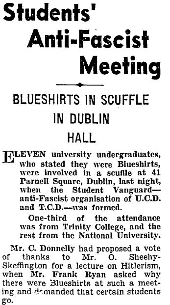 The meeting did not go entirely to plan though, and eleven Blueshirts made their presence known at the back of the room causing a scuffle to break out and the meeting to be interrupted. Bizarrely enough, it looks very much like the Blueshirts were present, somewhat under the blessing of Charlie Donnelly, who would later fight and die in Spain, on the Republican side. A Mr. K. Patton from UCD, who declared himself a Blueshirt stated at one stage “We promised Mr. Donnelly we wouldn’t cause any trouble here tonight.”