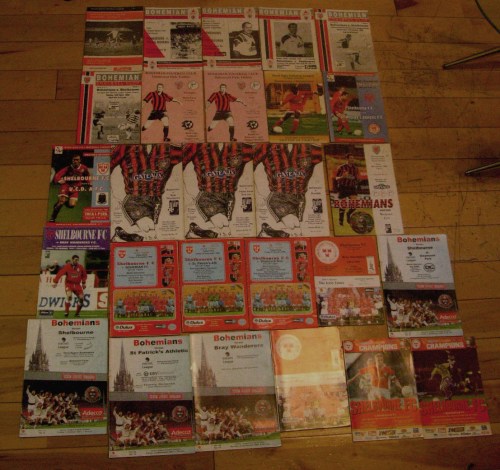 So, when I got a text from JayCarax last week saying there was a box of League of Ireland programmes going cheap, I jumped at the chance. I eventually got in on Sunday afternoon on nipped in and the result can be seen below- €20 for 27 programmes, mainly Bohs but a few Shels as well, spanning from 1992 – 2004. Twelve short years, but a lifetime in this League. Paul Osam to Peter Eccles, Gino Lawless to Avery John all feature. Owen Heary, Pat Fenlon and Stuart Byrne seem to appear ageless, bouncing back and forth between clubs and Tony Cousins appears, looking, well, pretty much exactly like he does now. Shels were a big club, and Bohs made a profit one season. Crazy times indeed.