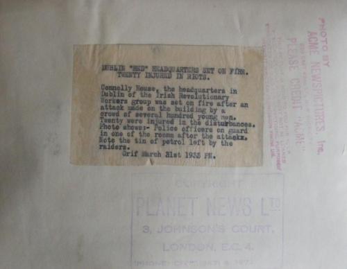 I’ve had the image below for quite a well now, a fantastic old press snap of two Gardaí inside Connolly House (located on Great Strand Street) after the attack on the premises in March 1933 by an anti-communist mob. Accounts of the night are always chaotic, for example in Pat Feeley’s wonderful article “The Siege of 64 Great Strand Street” (Old Limerick Journal,Vol. 9, Winter 1981) it is noted that: