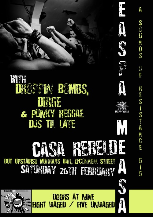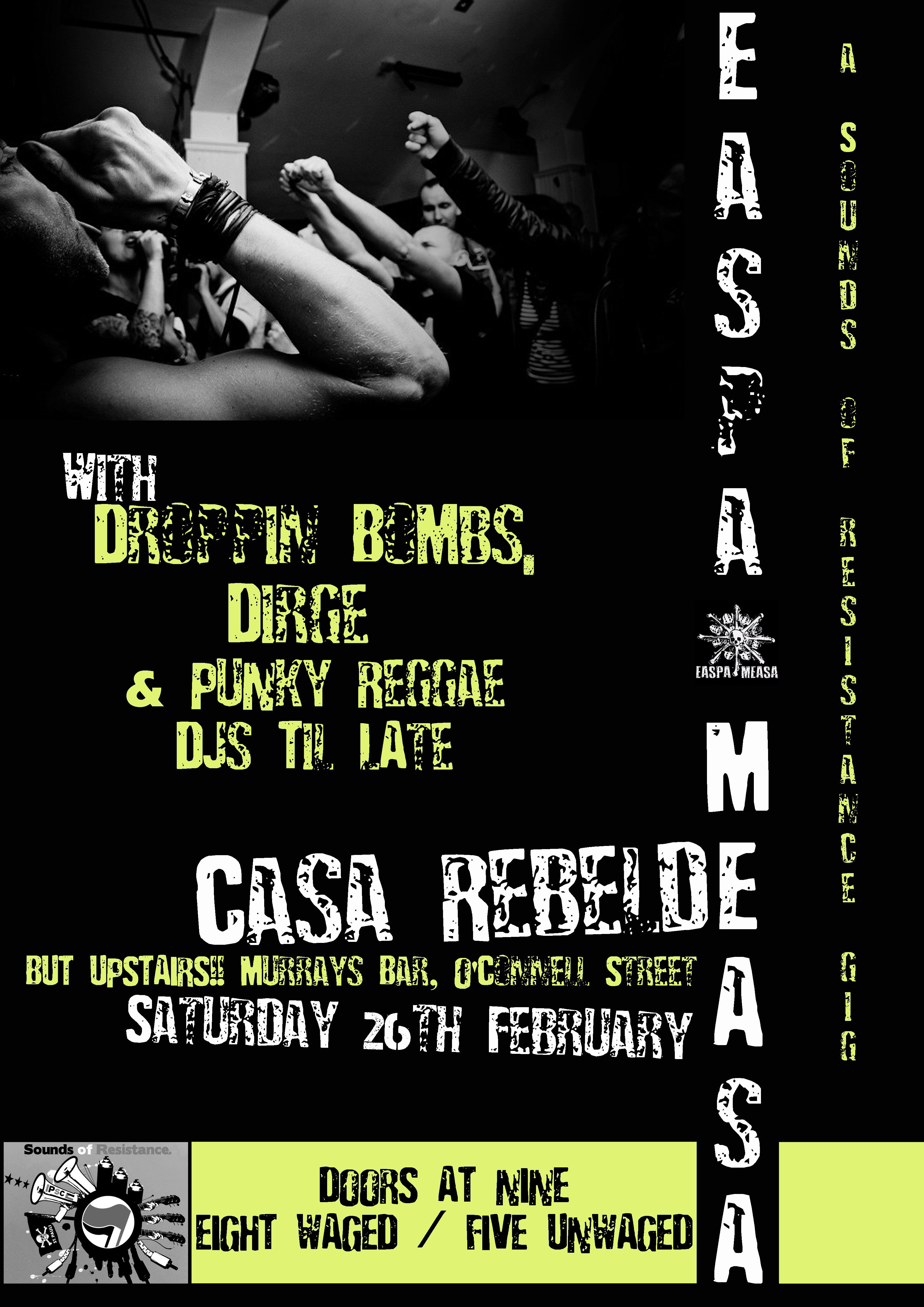 Coinciding with the implosion of Fianna Fáil and the inevitable trundling in of our new Fianna Gael overlords is a great weekend of music in Murray’s Bar on O’Connell Street. It looks set to be a busy weekend for us here at CHTM! too, with our involvement in both gigs. JayCarax and DFallon are spinning the decks on Friday night at the ever excellent Punky Reggae Party while I’ll be hitting the stage at some point on the Saturday night at the above gig; a thumping line-up containing Dublin crust legends Easpa Measa, Droppin’ Bombs and newbies Dirge. Following the bands will be Punky Reggae DJs until 2.30 AM. The gig is a joint fundraiser for the IPSC, AFA and the St. Pauli Supporters Club Dublin.