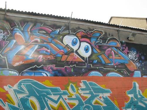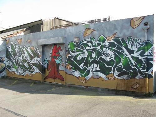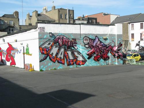 Dalymount Park, fresh from getting a pre-season lick of paint in the bars and corridors, got a lick of paint outside this weekend too as it played host to a selection of Dublin’s graffiti artists. Two-Headed Dog, Kevin Bohan, Marca Mix, Debut, Iljin, Tommy Rash, Kin Mx, Panda & Elroy and CJ Macken amongst others were involved in Dalymount’s first ever Spray Jam, with paint provided by http://www.vinnybyrne.com/ . Most are pictured below, a couple didn’t come out right, but I’ll get them again on Friday when Bohs play their first home game of the season.