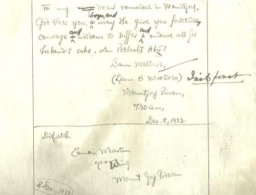 Mellows’ last message was delivered to Eamon Martin by a prison officer. It was written at 7.30am and ran: