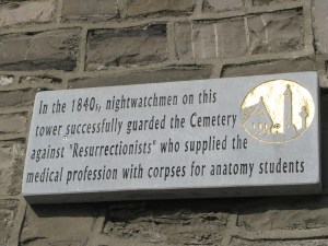 The cemetary is home to the graves of approximately 1.2 million people; A far cry from the nine acres it started out with in 1832,the area now stands at over 120 acres on one side of the road and a further 40 acres on the other, where the body of Luke Kelly now rests. It came into being initially due to reforms pushed through by Daniel O’Connell, whose tomb sits at the entrance to the cemetary. Prior to it’s existence, death was an expensive thing to endure, there being no Catholic burial grounds in Dublin and it costing a small fortune to bury a Catholic in a Protestant one. O’Connells tomb is of course marked by a 170ft tall round tower, which tends to stand out a wee bit! The tomb was the target of a loyalist bomb attack in the seventies, which shook the tomb itself, and blew up the stairs encircling the inside of the tower, closing it to the public. The Cemetary is surrounded on all sides by high stone walls, with towers on each corner. Not there to keep the dead in, they were built to keep grave robbers out. Grave robbing was a lucrative business in the 19th Century, corpses fetching £2, quite a sum in those days. Guards manned the towers from dusk to dawn, armed with muskets and pistols.