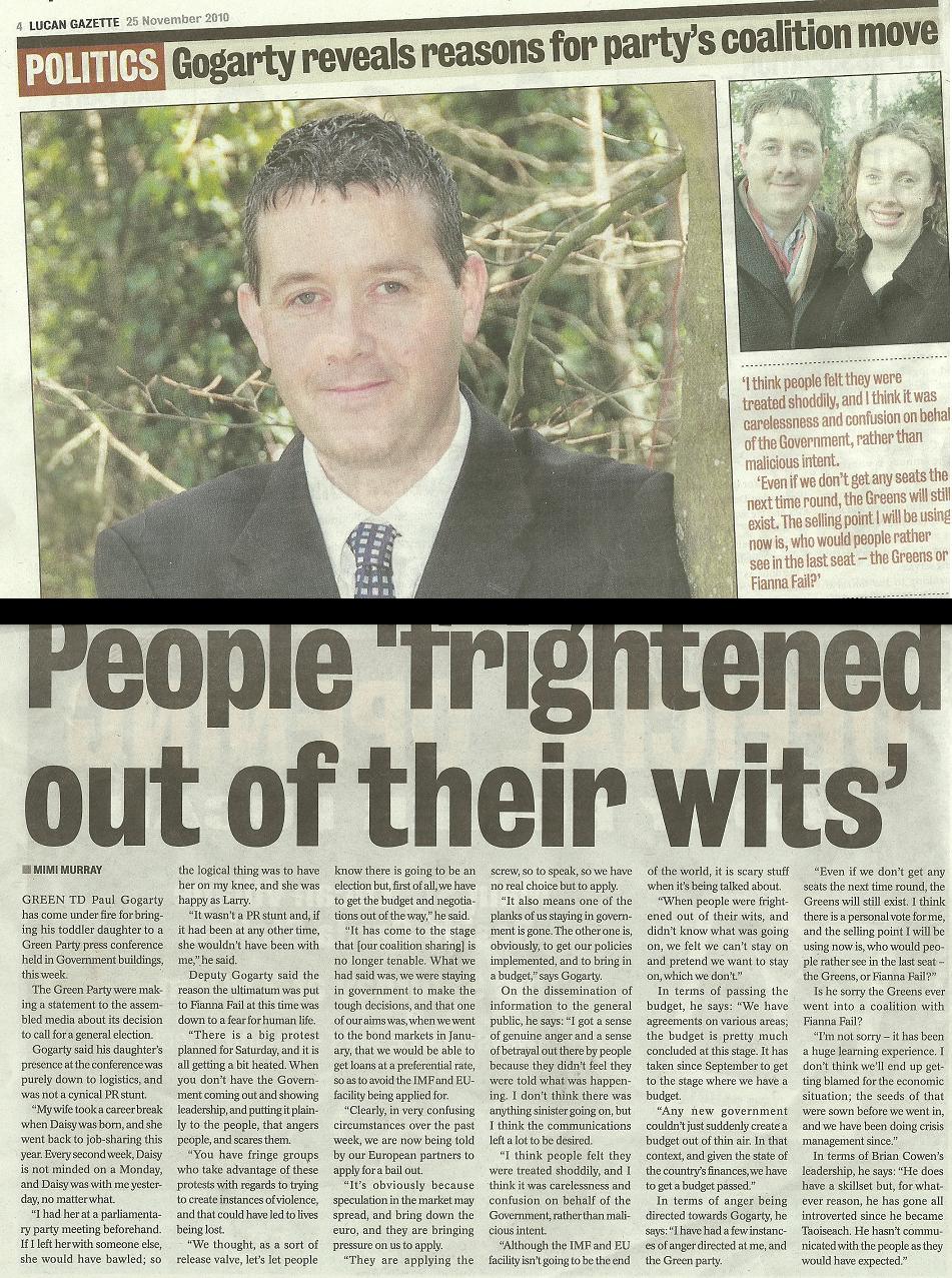 Paul Gogarty from The Green Party is one of my local TDs. Dublin Mid West looks completely bonkers to be honest, as not alone did the area put ‘Paul in the Dail’, but a certain Mary Harney too. She’s essentially been saying ‘fuck you’ to a whole load of people for the last couple of years, in less dramatic and far more deadly circumstances than Mr. Gogarty.