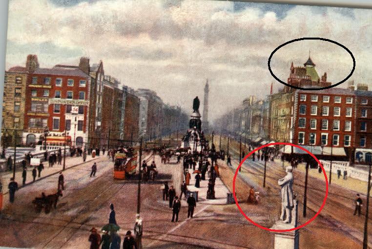 Who is the statue circled in red? It’s William Smith O’Brien. I never knew he was positioned at the corner of D’olier Street and Westmoreland Street for a period. The statue, by Thomas Farrell,was unveiled in 1870.